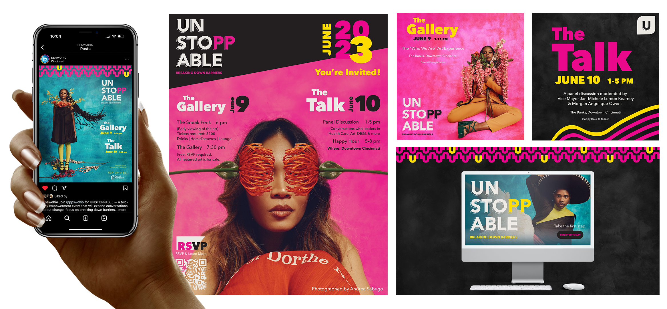 UNSTOPPABLE is a Planned Parenthood of SouthWest Ohio initiative centered around education, wellness, culture, and change making. Rooted Creative was hired to help with the rebrand and experiential buildout for the UNSTOPPABLE 2 day fundraiser event. The event consisted of a gallery/cocktail party and a panel discussion series. I created the branding, concepted and fabricated parts of the event decor.